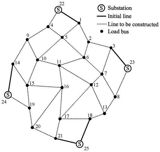 With the vigorous development and utilization of PV in distribution networks [1,2], the uncertainty of its output and the volatility of loads have brought great challenges to the balance of energy supply and demand [3]. At the same time, the load growth requires the expansion of the distribution network framework, and the unreasonable structure will seriously affect the operation of the system [4,5]. The ESS has the ability of bidirectional regulation [6]. The collaborative planning of ESS and PV can greatly improve the utilization rate of PV [7,8]; optimize resource allocation; and improve the reliability, security, and flexibility of distribution network operation [9,10]. Therefore, considering the uncertainty of PV output and load demand, it is of great practical significance to study the distribution network planning scheme, including site selection and capacity determination of PV and ESS, as well as network expansion.