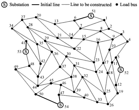 Based on the network construction data obtained from the solution, combined with the above planning and configuration results, the network topology diagrams after the 54-bus system planning for different schemes can be obtained, as shown in Figure 15.