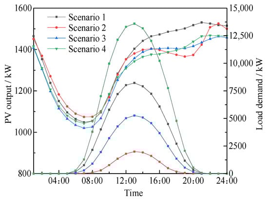 - By establishing a source load temporal–spatial correlation probabilistic model based on Copula theory and applying the Monte Carlo method and K-means clustering algorithm for scenario generation and reduction, four typical daily scenarios were obtained while preserving the variability of PV output and load demand. The results demonstrate that a small number of typical daily scenarios can effectively describe the uncertainty and temporal–spatial correlation of PV output and load demand variations while avoiding the curse of dimensionality during the solution process, further ensuring the computational efficiency.