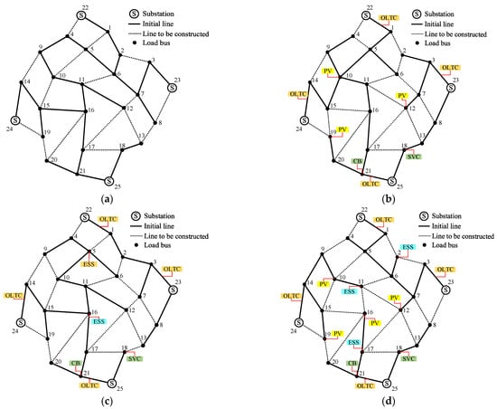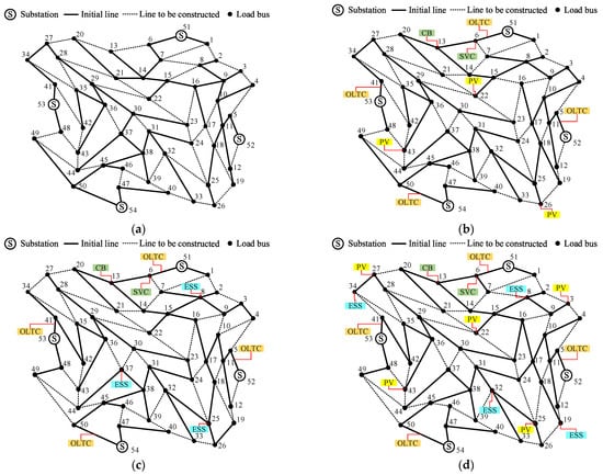 Planning results of the 54-bus system in different schemes. (a) Planning results of Scheme 1. (b) Planning results of Scheme 2. (c) Planning results of Scheme 3. (d) Planning results of Scheme 4.