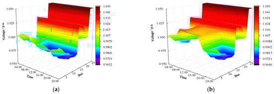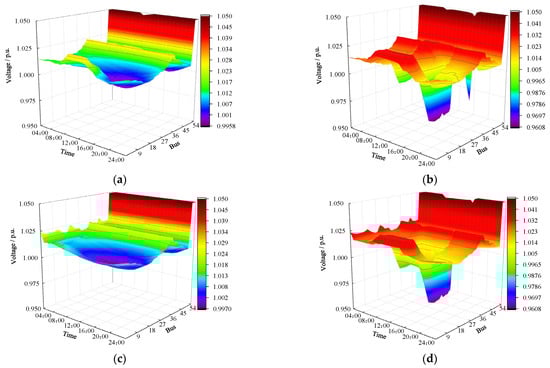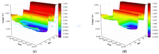 The hourly node voltage distribution within a single day for the 54-bus system under different schemes is shown in Figure 16.