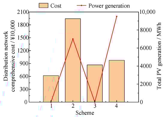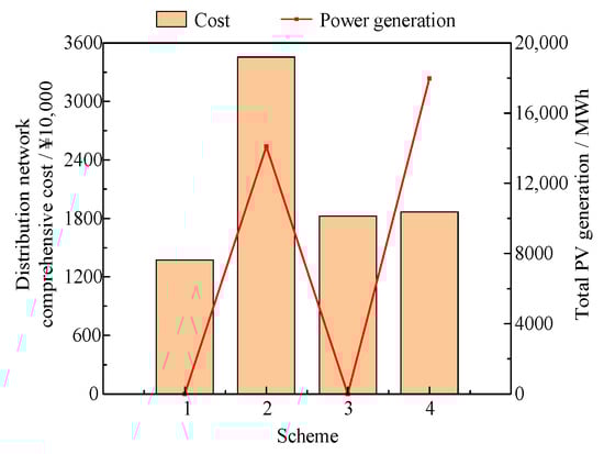 The comparison of the distribution network comprehensive cost, total PV installed capacity, and total PV generation before and after considering the source load correlation scenarios is shown in Table 18. After considering the source load temporal–spatial correlation scenarios, all schemes show a slight improvement compared to the schemes that do not consider these correlations. The typical daily scenarios generated using the source load temporal–spatial correlation probabilistic model based on Copula theory significantly mitigate the impact of source load uncertainty on the distribution network, enhance the network’s capacity for PV grid integration and absorption, and ultimately reduce the distribution network comprehensive cost, achieving an improvement in economic benefits.
