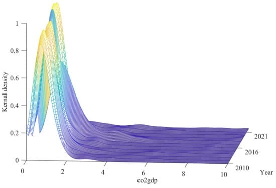 The dependent variable in our research is carbon emission intensity (CO2GDP). Regional carbon emissions are quantified by the ratio of total carbon emissions from cities at all levels to regional GDP, referring to the method of measuring carbon emissions proposed by Wu [41]. The lower the carbon emission intensity is, the less carbon emissions are generated by creating a unit of GDP. The kernel density plot in Figure 1 illustrates the carbon emission intensity of China for the years 2010, 2016, and 2021.