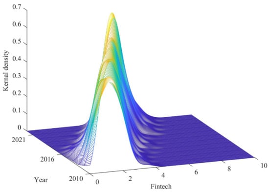 By comparing Figure 1 and Figure 2, it is observed that from 2010 to 2021, the kernel density graphs of carbon emission intensity and the development level of fintech exhibit similar overall characteristics in terms of ductility and rightward shift of the peak, which preliminarily suggests a potential relationship between fintech and carbon emission levels.