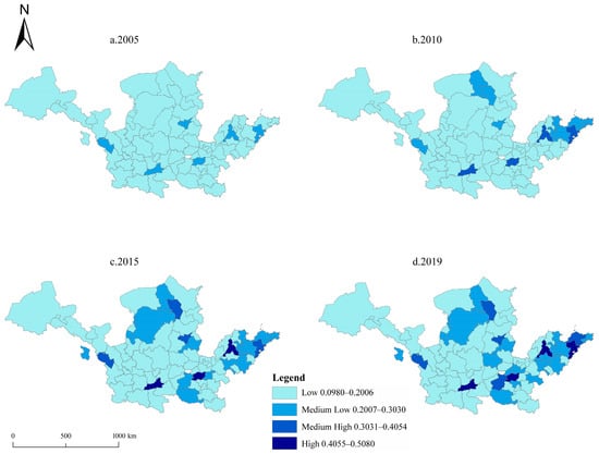 - Normalization—included to mitigate variations due to size and scale disparities among indices. The extremum approach is harnessed for standardization [39].Positive indicator:Negative indicator:where is the raw data value of the index of the city.