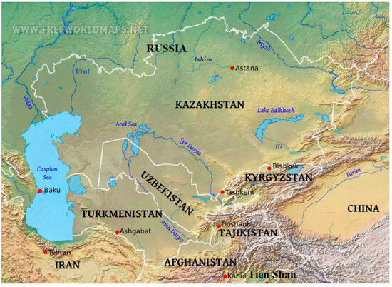 - Freeworldmaps.net. Central Asia Region with Major Water Resources. Available online: https://www.freeworldmaps.net/asia/central/centralasia-geography-map.jpg (accessed on 31 December 2024).