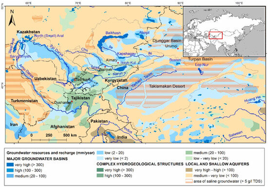 - Sagin, J.; Adenova, D.; Tolepbayeva, A.; Poryadin, V. Underground water resources in Kazakhstan. Int. J. Environ. Stud. 2017, 74, 386–398. [Google Scholar] [CrossRef]