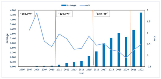The gravity value between cities for the years 2006–2022 is calculated using the improved gravity model previously discussed, and the overall degree of development of the digital economy is represented by the average gravity value of each city per year, with its time evolution trend being shown in Figure 1. Overall, in Chinese cities, the digital economy grew from 0.006 in 2006 to 4.592 in 2022, representing a leapfrog growth rate of 56.67% on average every year, indicating a significant upward trajectory. Regarding sub-periods, throughout the “Eleventh Five-Year Plan” (11th FYP) from 2006 to 2010, the level of the city’s digital economy remained relatively low, increasing from 0.006 in 2006 to 0.087 in 2010, marked by a high growth rate. This stage is the infancy of the growth of the digital economy. Between 2011 and 2015, the cities’ digital economy level rose from 0.168 to 0.892 in the “Twelfth Five-Year Plan” (12th FYP) era, reflecting an overall increase in the digital economy. The growth rate exhibits stable fluctuations within a bounded range, a pattern of the developmental phase in digital economy progression. In the 2016–2020 “Thirteenth Five-Year Plan” (13th FYP) period, the cities’ digital economy grew quickly, from 1.293 to 2.517 between 2016 and 2020, with the growth rate gradually slowing and a higher degree of development. This period corresponds to the high-speed growth stage. After the “Thirteenth Five-Year Plan” period, the digital economy entered a new stage, with the level reaching 4.592 in 2022, signaling rapid development and marking the take-off stage of the digital economy. From a broad standpoint, China’s urban digital economy is doing well generally, with notable development accomplishments.