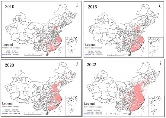 To illustrate the spatial linking pathways and structural changes among cities, as well as the variations in the digital economy’s spatial structure among Chinese cities, a gravity grid is constructed using the enhanced gravity model as a basis, and the spatial linkage structure of Chinese cities in 2010, 2015, 2020, and 2022 is mapped using the ArcGIS tool, as illustrated in Figure 2, respectively. To enhance the network visualization effect, reference is made to the methodological framework of related scholars, and values with a smaller gravitational force are deleted based on appropriate ratios (2.0000, 10.0000, 29.5000, 30.5000, and below are deleted from 2006 to 2022, respectively), and the strength of the cities’ association is categorized using the natural breakpoint approach. The results show that from 2006 to 2022, the spatial association network evolved continuously from a simple to a complex structure. The degree of linkage has been continuously strengthened, mainly radiating from the more economically developed first-tier cities, showing the trend of agglomeration development.