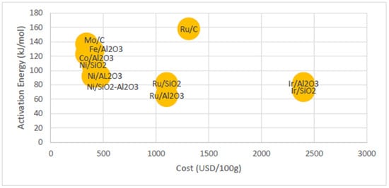 Currently, several methods for ammonia decomposition are in use; these methods include thermal decomposition, where ammonia is heated to high temperatures, and catalytic decomposition, which utilises catalysts to lower the activation energy and enable ammonia breakdown at more moderate temperatures. Significant research has been conducted on catalysts that can facilitate ammonia decomposition at lower temperatures, with the aim of improving the efficiency of the process and reducing energy input [9]. Studies have explored various materials, including precious metals, like ruthenium, and non-precious metals, like iron and nickel [10]. In a study conducted by Zikai Su et al. on the progress of ruthenium-based catalysts for hydrogen production from ammonia decomposition, they have achieved metal support interactions over Ru-based catalysts with high ammonia decomposition activity at 500 °C [11]. They made use of the large specific surface area of the metal support to improve the stability of the reaction and the conductivity of the support to modulate the electron to accelerate the adsorption of the nitrogen atoms. A.S. Chellapa et al. suggested that the reaction rate of ammonia decomposition via Ni-Pt/Al2O3 catalysts is highly dependent on the partial pressure of ammonia, whereas hydrogen inhibition could potentially occur at temperatures lower than 520 °C [12]. A study also demonstrated that Ni-based catalysts are more stable than Ru-based catalysts, as Ru-based catalysts suffer from the deactivation problem due to the loss of exposed Ru active sites [13]. Although Ru-based catalysts could achieve higher ammonia conversion, precious metals are not the best option for catalytic ammonia decomposition due to their high cost and limited supply, as shown in Figure 1. Catalysts with precious metals could achieve low activation energy and low decomposition temperatures; however, they are not economically feasible for long-term hydrogen generation, as the price of precious metal catalysts is about twice the price of base metal catalysts, like Fe, Co, Mo, or Ni. Hence, the usage of catalysts based on Ni or Fe is more sustainable in the long run and more common.