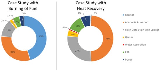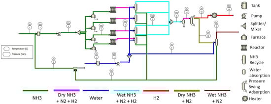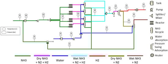The second case study shown in Figure 6 used the same flow system as that in the first case study, except for the reactor. The reactor was heated by the convection heat with a target temperature of 923 K (650 °C) (hot gas) and decomposition of ammonia at a temperature of 923 K (650 °C) with the assumption of using a Ni catalyst [9]. The heat transfer efficiency of this reactor design is, according to reference [9], assumed to be 91%. The duty heat and power for the flow in Figure 6 are shown in Table 4.