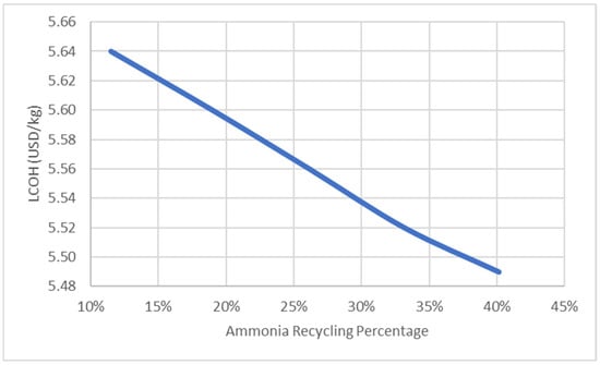 The LCOH is estimated at USD 11.28/kg for hydrogen production via the electrolysis of water based on alkaline electrolysis technology by using 50% energy from grip power and 50% energy from PV plants at a medium production capacity of 100 kg/day [17]. LCOH via water electrolysis could be lower with more efficient technology that has lower electricity consumption. Antonio Villalba-Herreros et al. conducted a techno-economic study on the LCOH of green hydrogen under three different scenarios: (1) producing green hydrogen on-site using water electrolysis, (2) offshore production of hydrogen using electrolysis, liquefying and transporting liquid green hydrogen to the site, and then regasification on-site, and (3) offshore production of hydrogen using electrolysis, conversion of hydrogen into ammonia, then transporting ammonia by ship and cracking ammonia on-site [18]. This study also suggested that blue hydrogen would have a LCOH that is 65% lower than that of green hydrogen and the LCOH for thermos-catalytic ammonia cracking is about 40% lower compared with the LCOH for water electrolysis. In addition, the LCOH of water electrolysis is highly dependent on the electricity tariff. It is worth mentioning that on-site or off-site hydrogen production via ammonia decomposition could be more likely to achieve a greener future. This approach offers significant advantages, including efficient hydrogen storage and transport, and the possibility of reusing energy sources for conversion.