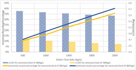 Figure 12 shows the effect of the process parameter, which is the reactor temperature, on the LCOH. The reactor temperature increases with the temperature of the exhaust gas intake; this will enhance the conversion of ammonia and produce more hydrogen, which resulted in lower LCOH with lower consumption of ammonia. However, this would rely on the thermal efficiency of the designed reactor. High thermal efficiency would result in high reactor temperature, but the degradation of material in the reactor should be taken into consideration. Figure 13 shows the effect of the ammonia recycling percentage on LCOH. LCOH decreases with the ammonia recycling percentage as less ammonia feed is used and leading to lower consumable material costs. To optimise the onsite hydrogen production system, the ammonia feed rate is reduced to 380 kg/s, provided that the hydrogen produced is sufficient for gas turbine usage. Figure 14 depicts the effect of varying water flow rate on the ammonia recycling percentage and LCOH. In addition, the results show that the LCOH for an ammonia feed rate of 380 kg/s was about 17% lower than the LCOH for an ammonia feed rate of 480 kg/s, which produced sufficient hydrogen output with higher water demand for ammonia recycling process.