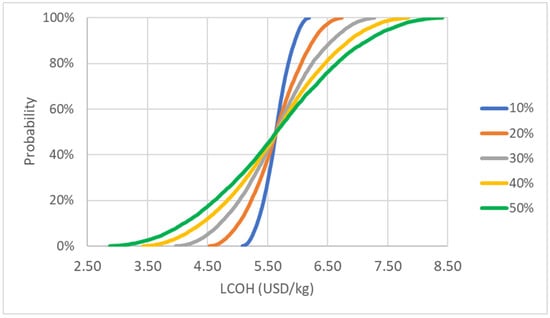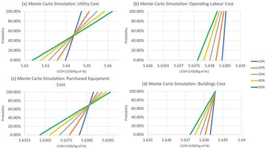 Probability curve of LCOH for variation in (a) utility cost, (b) labour cost, (c) purchased equipment cost, and (d) buildings cost.