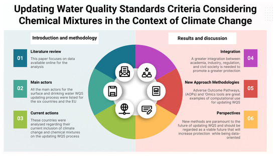 The model for updating WQS in response to climate change and chemical mixtures should start with the integration of QSAR and Omics technologies to predict possible interactions between a given set of compounds and the biological systems [57]. The first step should demonstrate the behavior of the compounds in the mixture with an increased temperature. The second step should provide a report on the chemical mixtures with the most potential to cause harm to biota and humans and, subsequently, the main biological structures that were affected by the evaluated mixture.