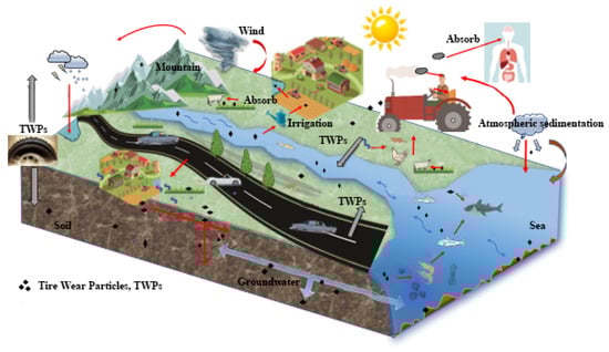 TWPs represent one of the most pervasive and environmentally mobile classes of microplastics, exhibiting complex transport dynamics across atmospheric, aquatic, and terrestrial systems [49,50,51]. Their environmental behaviour is governed by an intricate interplay of physical, chemical, and biological processes that collectively determine their spatial distribution, persistence, and ultimate ecological impacts [52,53] (Figure 1). Understanding these multifaceted migration pathways is crucial for developing accurate environmental risk assessments and formulating effective mitigation strategies in response to the growing global demand for vehicles.
