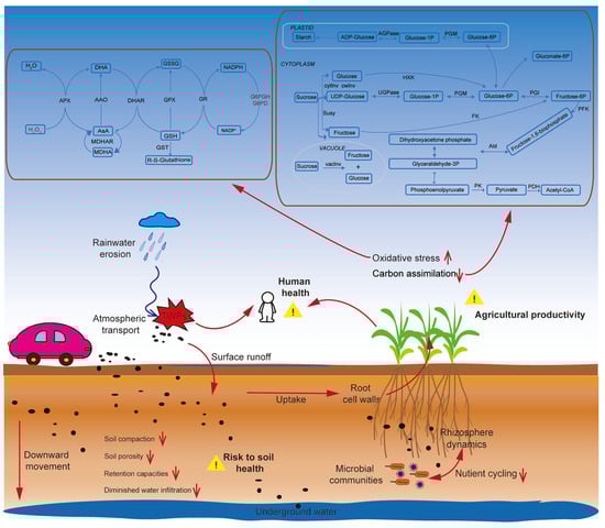 The widespread distribution of TWPs across environmental compartments poses significant risks to soil health, agricultural productivity, and human health [5,6,7,8]. Their complex chemical composition, including heavy metals, organic additives, and persistent polymers, enables multifaceted toxicity mechanisms that threaten ecosystem integrity and public health [66,67,68,69,70,71].