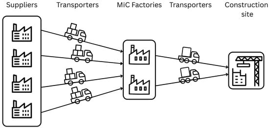 A schematic representation of an MiC supply chain showing the flow of materials and modules between suppliers, factories, and construction sites.