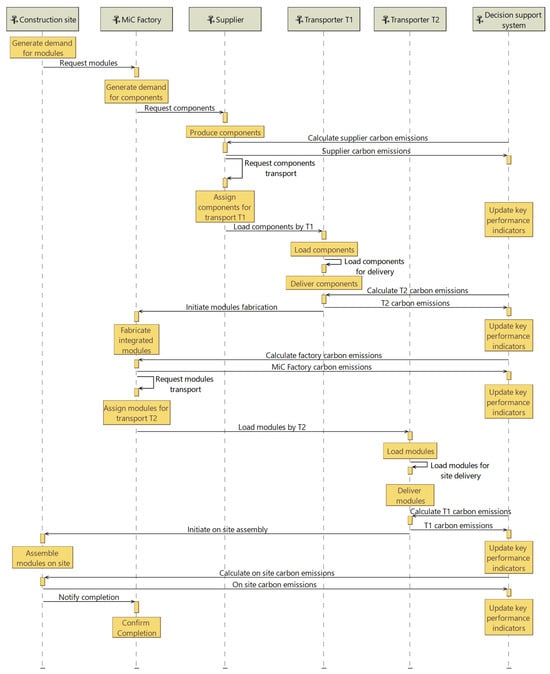 A sequence diagram of multi-agent interactions in the MiC supply chain with carbon emission tracking.