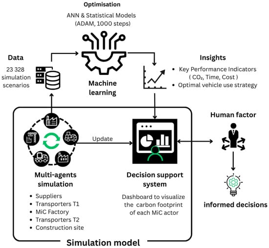 To address these limitations, recent developments have turned to digital twin and cyber-physical frameworks to integrate real-time monitoring with carbon tracking [57,68]. Agent-based and simulation-driven approaches are also increasingly explored to capture time-dependent emissions and economic trade-offs in modular supply chains. While the present study does not apply conventional LCA, it contributes to this growing body of research by proposing a hybrid method that combines multi-agent simulation and deep learning. This allows for scenario-based evaluation of emissions and costs under varying logistics strategies, enabling planners to account for temporal interactions, geographic distribution, and decentralized decision making in a way that complements and extends traditional LCA frameworks.