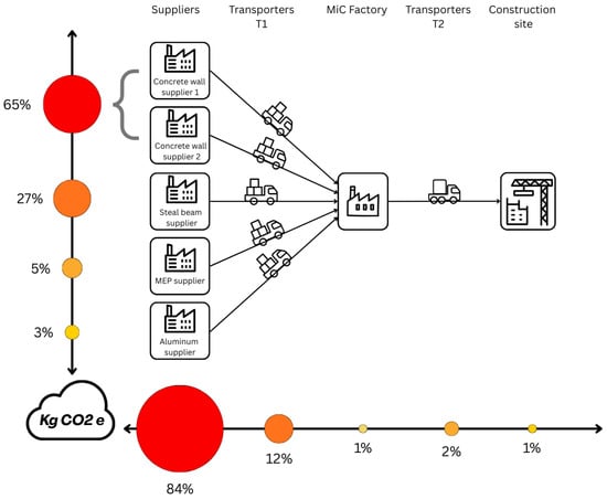 In this study, we evaluated both the transportation cost and the environmental impact of the MiC supply chain by measuring the carbon footprint associated with each of its main actors. To achieve this, we introduce an important key performance indicator (KPI) that reflect the sustainability of logistics operations, which in this context is the amount of carbon dioxide equivalent () emissions generated throughout the supply chain.