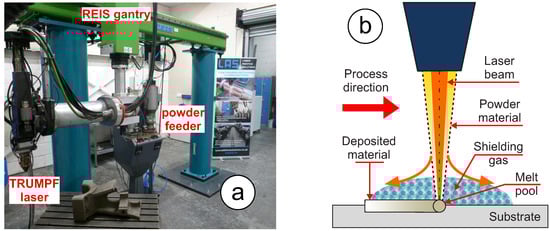 Figure 2. LMD experimental process: (a) LMD equipment at Laser Additive Solutions (LAS) Ltd., (b) schematic of the LMD process. - 5-axis REIS RL80 gantry manipulation system (made by Reis Robotics GmbH based in Obernburg 63785, Germany), as shown in Figure 2a.