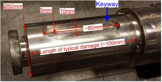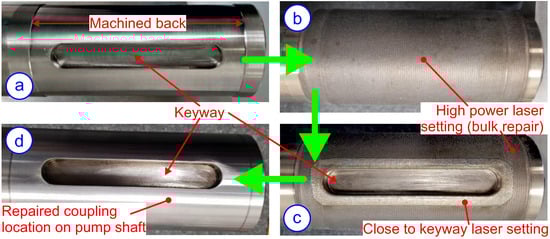 One of the most challenging locations on the pump shaft to repair is the coupling location. The design function of the shaft coupling location is to transmit torque loads through the keyways of shafts, and it is therefore a critical design feature and repair of this area needs to be undertaken using fully evaluated and controlled processes. The keyway in the coupling location does not need to be repaired. However, the damage that is noted in the coupling location is approximately 100 mm in length and 0.5 mm maximum depth, as shown in Figure 3. For the investigation in this paper, a common size of pump shaft of around 50 mm diameter and 2 m long was used. And prior to LMD repair the coupling location was machined back by 0.5 mm (radial) and 100 mm length to represent a “typical damaged” area, as shown in Figure 4a. The shafts were then vertically suspended in a furnace at 200 °C, the furnace temperature was raised at a maximum heating rate of 100 °C/h to 330 ± 10 °C, and the shafts were held at this temperature for 2.5 h before being cooled in still air to relieve the stresses, as carried out in some major industries.
