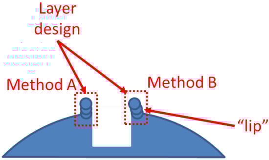 The setup for the repair of the coupling location is shown in Figure 5—the shaft is supported at one end by the chuck, and two support rollers were used to reduce the run out of the shaft. Super duplex in powder form was deposited by the LMD machine on to the coupling location, as shown in Figure 4b. For the bulk of the coupling location, as shown in Figure 4c, three layers were deposited using optimised high-power laser settings for fast deposition, and close to the keyway, three layers were deposited using the reduced power and spot size close to keyway laser settings to better control the deposit. On the keyway, a “lip” was created (Method B) instead of Method A in order to meet the dimensions of the keyway—a schematic of this is shown in Figure 6. The “lip” is very small and can be removed with a file and grinding paper, creating a straight edge on the keyway. Method A would have created the potential for undesirable weld undercut features to occur to the keyway.
