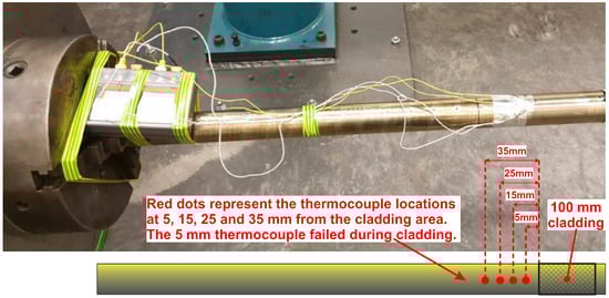 Thermocouples were used to determine the temperatures during the worst-case scenario of cladding at one end of the shaft. The worst-case scenario is formed by cladding the shaft without any dwell times. In comparison, dwell times reduce the overall temperature and are currently standard in repairing the coupling location due to the complexity of the cladding around the keyway as many measurements are required during the process to align the laser head and shaft at the required working distance. Furthermore, thermocouples were placed 15, 25, and 35 mm away from the edge of the overlay along the shaft, as shown in Figure 7, and temperatures were recorded throughout the LMD stage. In addition, the straightness of the shafts were measured pre- and post-LMD work using a dial gauge along several locations on the shafts and at 90° intervals around the circumference. During the measurements, the shaft was suspended on two v-blocks.