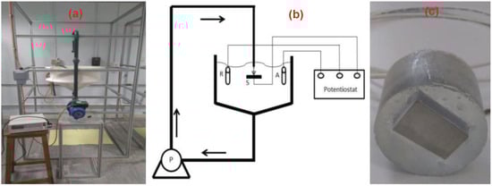 Jet impingement apparatus used in the potentiodynamic polarisation tests: (a) laboratory setup; (b) schematic diagram; (c) potentiodynamic polarisation test sample.