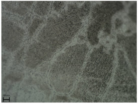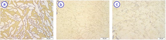 Two phase measurement methods were used to pick up the phases present in the LMD overlay and substrate. The samples were first etched in a solution of potassium ferricyanide and potassium hydroxide—Murakami’s reagent according to ASTM E407 [21] etchant number 98. If present, this method stains carbides and sigma phases. The samples were then electrolytically etched in 40% KOH at 2.5 V according to ASTM E407 [21] etchant number 97. This method is used to stain sigma, chi, and ferrite phases. Furthermore, the ferrite content of the substrate was determined over 16 adjacent fields, using a grid of 25 points. The ferrite content was conducted as per ASTM E562 [22] at ×500 magnification, as shown in Figure 10a for base metal and Figure 10b for cladding, and at ×1000 magnification, as shown in Figure 10c for cladding. And a ferrite scope was also used to determine the ferrite content by magnetic induction.