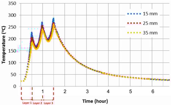 The total time for cladding all tracks in each layer during the worst-case scenario was just below 30 min, and three layers were clad. The recorded temperatures are plotted over time in Figure 11. As can be seen from this figure, there is a cumulative effect with increasing bulk temperatures with each additional weld pass, and this resulted in the maximum interpass temperature of 150 °C being exceeded. After the final layer was clad, the peak recorded temperature took 38 min to cool down from 287 °C to below the interpass temperature. Whilst this was undesirable, it is thought that the short temperature excursions during the overlay will not have any damaging effect to either the weld deposit or the base material. At the lower embrittling temperatures (circa 300 °C), the holding time would need to be many hours before any effect would occur.