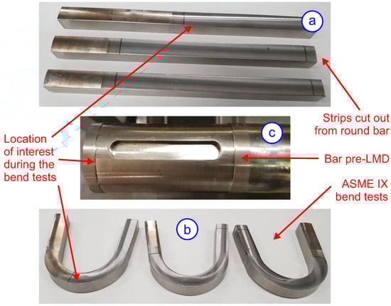 Mechanical bend testing according to ASME BPVC.IX [18]: (a) specimens with cladding cut out of the bar and subjected to ASME IX loads; (b) successfully passed specimens; (c) bar pre-LMD.
