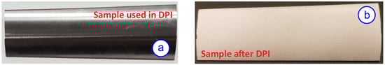 Dye penetrant inspection (DPI) according to ASME BPVC.IX [18]: (a) machined back sample from LMD overlay of coupling location; (b) sample with developer as part of DPI.