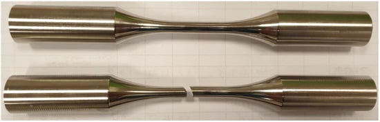 Two mechanical testing procedures were used to assess the ductility of the repaired area. The first test consisted of a mechanical bend procedure widely used in industry, in accordance with ASME BPVC.IX [18] code. The specimens for this test were cut out, using a mechanical saw and water jet cutting equipment, in approximately 10 mm thick rectangular sections of the repaired area that consisted of both LMD overlay and substrate. The sections were subjected to ASME BPVC.IX [18] specified loads with an acceptance criterion of no crack formation on neither the overlay nor the substrate. Furthermore, to understand in more depth the mechanical properties of the LMD-repaired area, fatigue testing was undertaken using an ESH 120 kN capacity servo hydraulic test machine, along with Instron hydraulic grips under cyclic (compression–tension) loading. This fatigue testing method has a symmetric stress cycle (R = −1) and therefore resembles a piece of rotating equipment that has a symmetric loading profile (minimum to maximum absolute values). The specimens used in this investigation consisted of 50:50 LMD and original wrought super duplex alloy, as shown in Figure 8.