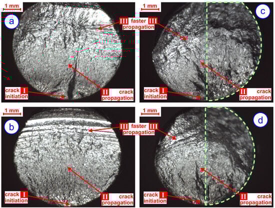 Furthermore, fractographic images of the respective test piece fracture surfaces were recorded using an optical stereo-microscope, as shown in Figure 15. The fractographic features of the benchmark trials with and without stress relieving are shown in Figure 15a,b, respectively. And the fractographic features of the samples with 50% LMD with and without stress-relieving trials is shown in Figure 15c,d, respectively. All of the fatigue test specimens exhibited classic fatigue marking (refer to [27,28] for a comprehensive investigation) for the initial stages of cracking, and this is followed by an area of fast/final rupture. The crack origin positions all coincided with the surface of the specimens.