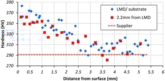 The hardness tests were conducted using a Mitutoyo MVK-G1 digital micro-hardness tester using a 200 g load. The hardness plot for the LMD overlay and substrate is shown in Figure 16. The hardness is up to 92 HV higher than the supplier’s nominal data in the overlay. The closer the overlay is to the substrate, the closer the hardness is to the supplier’s nominal levels. It is thought that some of the higher hardness is caused by the machining back of the surface, which has led to work hardening effects—this is a common difficulty when machining or drilling stainless steels, in particular austenitic based ones [29]. The micro-hardness measured 2.2 mm away from the LMD, also plotted in Figure 16, is up to 71 HV higher than the supplier’s nominal data in the overlay. Furthermore, macro-hardness measurements were taken at the surface of the overlay, as shown in Figure 17, with corresponding values reported in Table 6. Five individual indents were used for the macro-hardness measurements, and these values have an average of 345 HV. This is around 55 HV higher than the supplier’s nominal data in the overlay. For both micro- and macro-hardness measurements, the increase in hardness is considered to be within acceptable limits. Similarly, an increased hardness in the weld area was noticed in [30], when using laser welding without filer material.