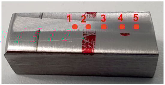 Macro-hardness specimen with measurement points taken at red dots as listed in Table 6.