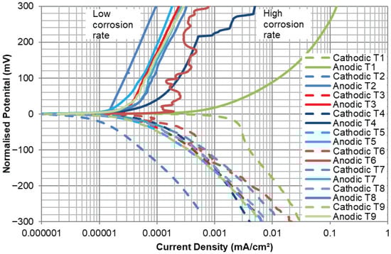 All LMD overlay and substrate samples passed the ASTM G48 Method A corrosion test in accordance with the standard ASTM v.03.02 [19], as shown in Table 4, with no weight loss and no pitting at ×20 magnification. In addition, potentiodynamic polarisation scans were conducted to assess the corrosion behaviour of the test materials (high- and low-power laser setting overlays of super duplex compared to wrought [rolled bar] super duplex), as shown in Figure 18. The potentiodynamic polarisation scans involved conducting scans in both anodic (more electropositive from the free corrosion potential, ) and cathodic (more electronegative from ) directions. The tests were conducted by shifting the potential either 300 mV above (anodic) or below (cathodic) . In order to calculate the corrosion rates of the materials, the Tafel extrapolation method was used to evaluate the corrosion current density, . From this, Faraday’s Law was used to calculate the corrosion rate in terms of mm/yr. For clarity, the higher the corrosion current density, , the larger the corrosion rate (i.e., polarisation scans which are furthest on the right on the x-axis, as shown in Figure 18, have the highest corrosion rates).