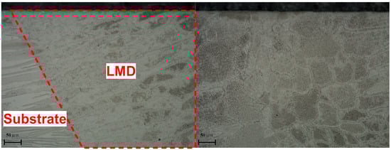 Samples for the microstructural investigation were cut to approximately 20 × 20 mm from the LMD overlay and substrate, mounted, polished to 0.05 μm diamond paste, and electrolytically etched with 10% oxalic acid electrolytic. The samples were observed under a light optical microscope (LOM) for observations of the microstructural characteristics, and in particular of the heat affected zone and dilution. LOM was also used to check for micro-cracks and porosity. Furthermore, scanning electron microscopy (SEM) was used to observe the microstructure at higher magnification of the powder, LMD overlay, and substrate. And energy dispersive X-ray spectroscopy (EDS) was used for the semi-quantitative chemical analysis. For both SEM and EDS, a Hitachi S-3700 tungsten filament scanning electron microscope with an accelerating voltage was used, which was manufactured by Hitachi High Tech Corporation based in Minato-ku, Tokyo 105-0003, Japan.