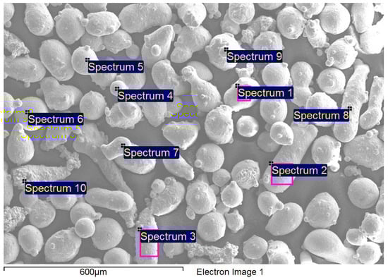 The powder particles that were used during the cladding on the coupling location of the shaft are shown in Figure 21. It was noticed that the chemical composition using point and area spectrums in SEM was in close agreement with the supplier’s nominal composition, as shown in Table 8. In addition, the powder was predominantly spherical with a size around 100 microns, and some elongated irregular shaped particles were also noted. As there was no such powder readily available in the market, this had to be created as a one-off; it is thought that higher quality powder that has almost all particles the same optimised size will further enhance the cladding qualities.