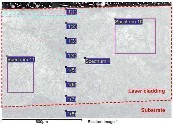 Furthermore, the chemical composition of the super duplex laser cladding on the super duplex substrate are shown in Figure 22 (tabulated in Table 9). It was noticed that the chemical composition was in close agreement with the supplier’s nominal composition. The cooling and reheating between each layer had no significant detrimental effects on the microstructure chemical composition, and a full dilution into the substrate was observed with no micro-cracks and porosity. Although the dilution was small, it did not affect the bonding strength, as proven by the successful ASME mechanical bend tests. In order to increase the dilution, one way is to increase the laser power, as detailed in [36]. However, in this case the dilution was deliberately kept small with lower laser power settings to avoid high temperature zones for long periods that create detrimental phases.