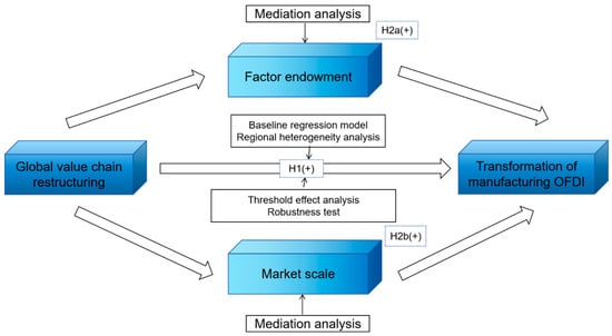 Secondly, the expansion of the market scale can promote the transformation of manufacturing OFDI. Specifically, enterprises can gain more sales opportunities and profit margins by entering countries with large markets through OFDI. Meanwhile, the expansion of market scale can bring about economies of scale and enhance competitiveness []. In addition, the economy of scale effect can also prompt enterprises to innovate in technology, management, and other aspects. Furthermore, countries with large markets are usually accompanied by better infrastructure and resource advantages, which provide better production conditions and a development environment for manufacturing enterprises []. By utilizing local resources and infrastructure, enterprises can reduce production costs and improve efficiency, thus realizing the transformation and upgrading of OFDI. Based on the above analysis, the following hypothesis is proposed: