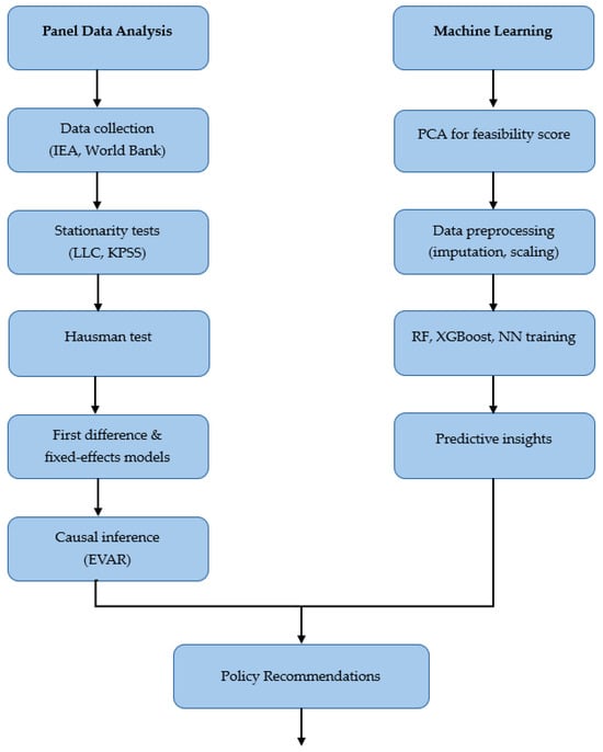 This study employs a novel dual-method design, combining causal inference with predictive analytics. First, panel data analyses quantified the causal impact of policy interventions, economic variables, and techno-economic factors on EV adoption rates. Second, a supervised machine learning (ML) approach employed Random Forest (RF), XGBoost, and neural network models enhanced by SHAP to predict EV adoption feasibility scores and identify non-linear patterns and sensitive variables. This dual-method framework combined the strengths of causal inference with predictive accuracy, offering a comprehensive understanding of EV integration dynamics across diverse regions. The methodology is designed to address the research questions outlined in the Introduction while accounting for regional variations and data limitations.