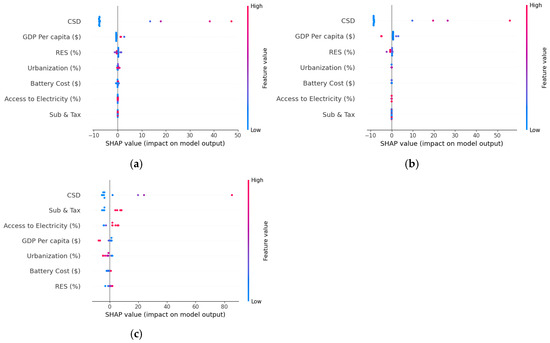 In response to these limitations, machine learning models have gained traction for their ability to model high-dimensional, non-linear, and interactive relationships in EV adoption. Shil et al. [66], employing Random Forest and XGBoost on U.S. data (2015–2020), identified rebates and subsidies as strong predictors, achieving an R2 of 0.85 with Random Forest. Kamis and Abraham [67], using gradient tree boosting and random-effects regression across U.S. states, found that solar energy share, education, and air quality were important predictors of EV penetration. These models outperform traditional regressions in capturing non-additive effects and interaction terms, though they typically lack causal interpretability unless paired with model explanation techniques like SHAP or counterfactual inference.