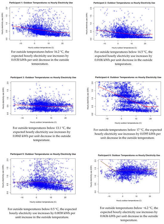 Relationships between the outdoor temperatures and electricity use (participants 1–7).