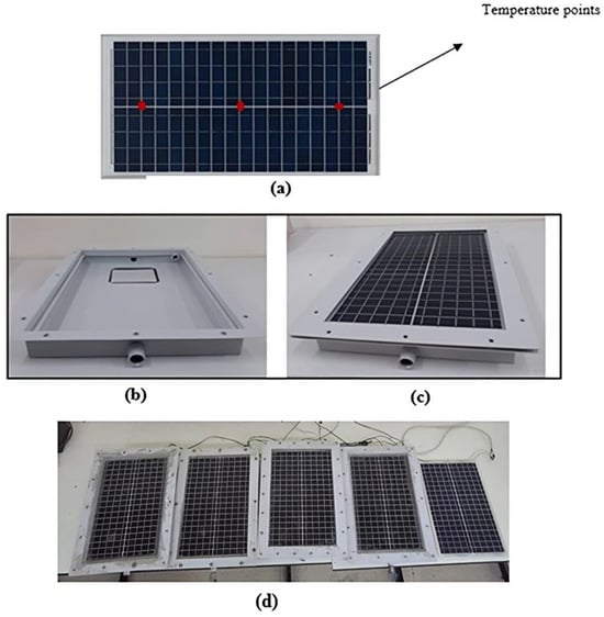 Figure 2 presents a schematic diagram of the PV solar energy system integrated with a cooling channel, while Figure 3 displays the physical setup of the PV panels equipped with these cooling mechanisms. The experimental rig consisted of five monocrystalline PV panels, each with a rated power output of 30 watts. Four of these panels were fitted with rear-mounted cooling channels, whereas the fifth panel—maintained without cooling—served as a reference for performance comparison. The technical specifications of the PV panels used in the experiments are detailed in Table 1.