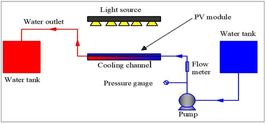 The experimental setup, as illustrated in Figure 4, consists of several components designed to manage and measure the cooling process effectively. A 1 m3 cold-water tank serves as the reservoir, supplying water to the system. The water is pumped into the cooling channel via the water pump, and its flow is regulated by the flow meter. The PoMs within the sub-panel cooling channel enhance thermal transfer from the PV module to the circulating water. As the water absorbs heat from the panel, which has been exposed to solar radiation from the simulator, it warms up and is subsequently directed to a 1 m3 hot-water tank. This cooling loop is essential for evaluating the impact of PoMs on PV panel performance. It is also worth mentioning that previous studies [17] developed a mathematical model to estimate PV panel temperature under similar operating conditions, providing a basis for validating experimental observations.