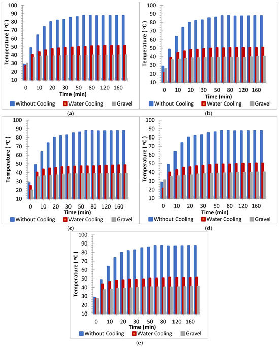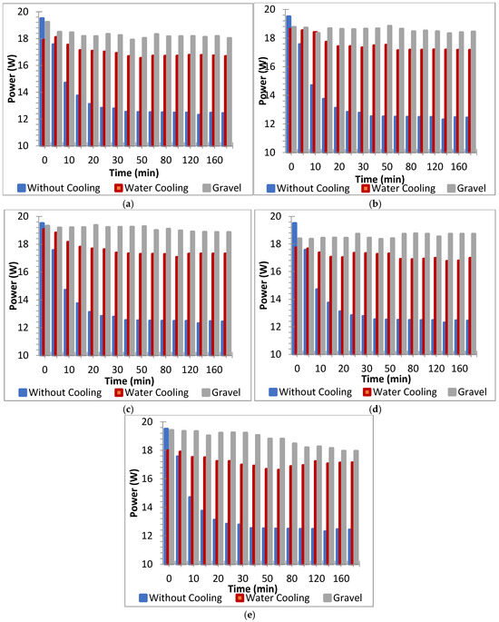 This metric quantifies the cooling effectiveness in mitigating PV panel overheating, which is crucial, as excess heat can significantly impair the panel’s energy conversion efficiency. The second metric, the percentage power increase, was calculated to quantify the improvement in electrical power due to the cooling effect using PoMs. This was determined with the following formula: