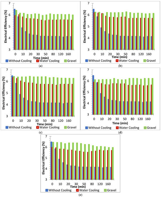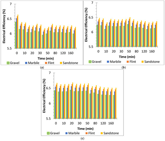 The data presented in Table 9, alongside Figure 11, provide a comprehensive view of the influence of different types of PoMs and volume flow rates on the electrical efficiency of P) panels. At a flow rate of 1.0 L/min, all PoMs significantly improve the electrical efficiency of the PV panels compared to the baseline (4.13%). Gravel increases the electrical efficiency to 5.99%, representing a 45.04% gain. Marble and flint perform slightly better, with flint reaching 6.18%, corresponding to a 49.64% improvement. Sandstone proves to be the most effective medium, achieving an electrical efficiency of 6.23%, which marks a 50.85% increase over the no-cooling condition. These gains, even at the lowest tested flow rate, demonstrate the important role of thermal regulation in enhancing electrical efficiency.